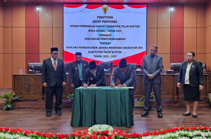 BINTUNI, jurnalpapua – Dokumen Rancangan Peraturan Daerah (Raperda) Rencana Pembangunan Jangka Menengah Daerah (RPJMD) Kabupaten Teluk Bintuni periode 2025 – 2029, disahkan menjadi Peraturan Daerah (Perda) melalui Rapat Paripurna DPRK Teluk Bintuni Masa Sidang I Tahun 2025, Rabu (22/10/2025).